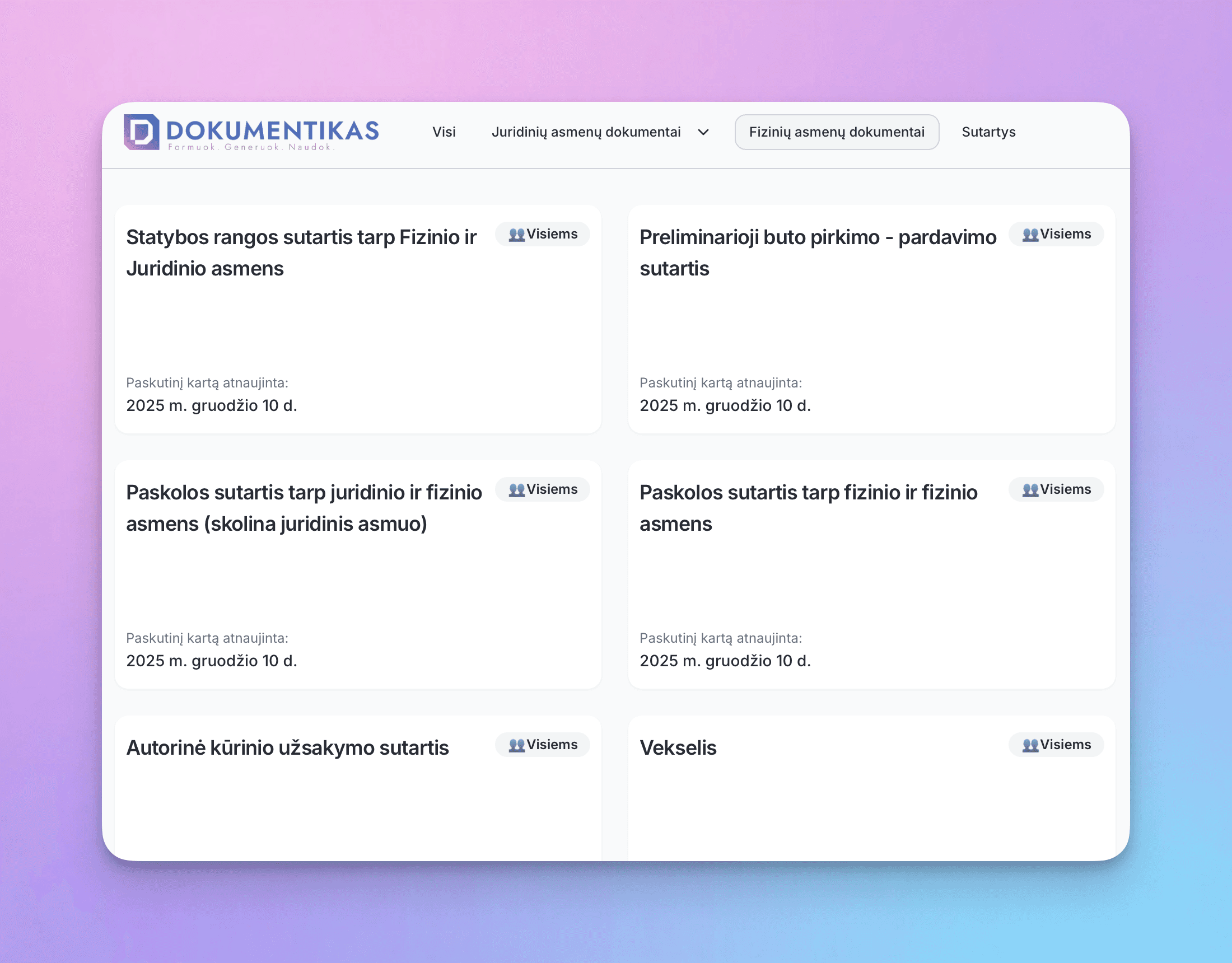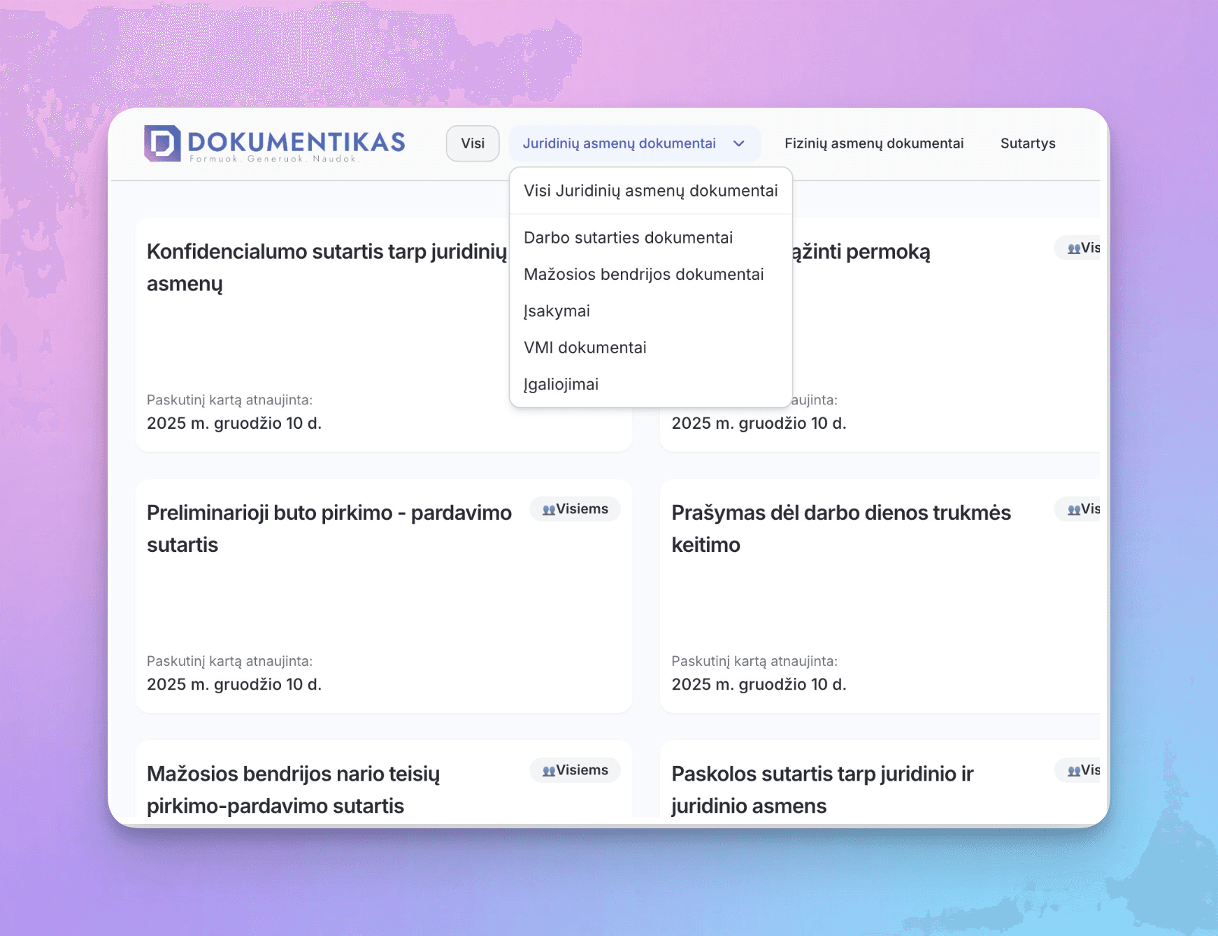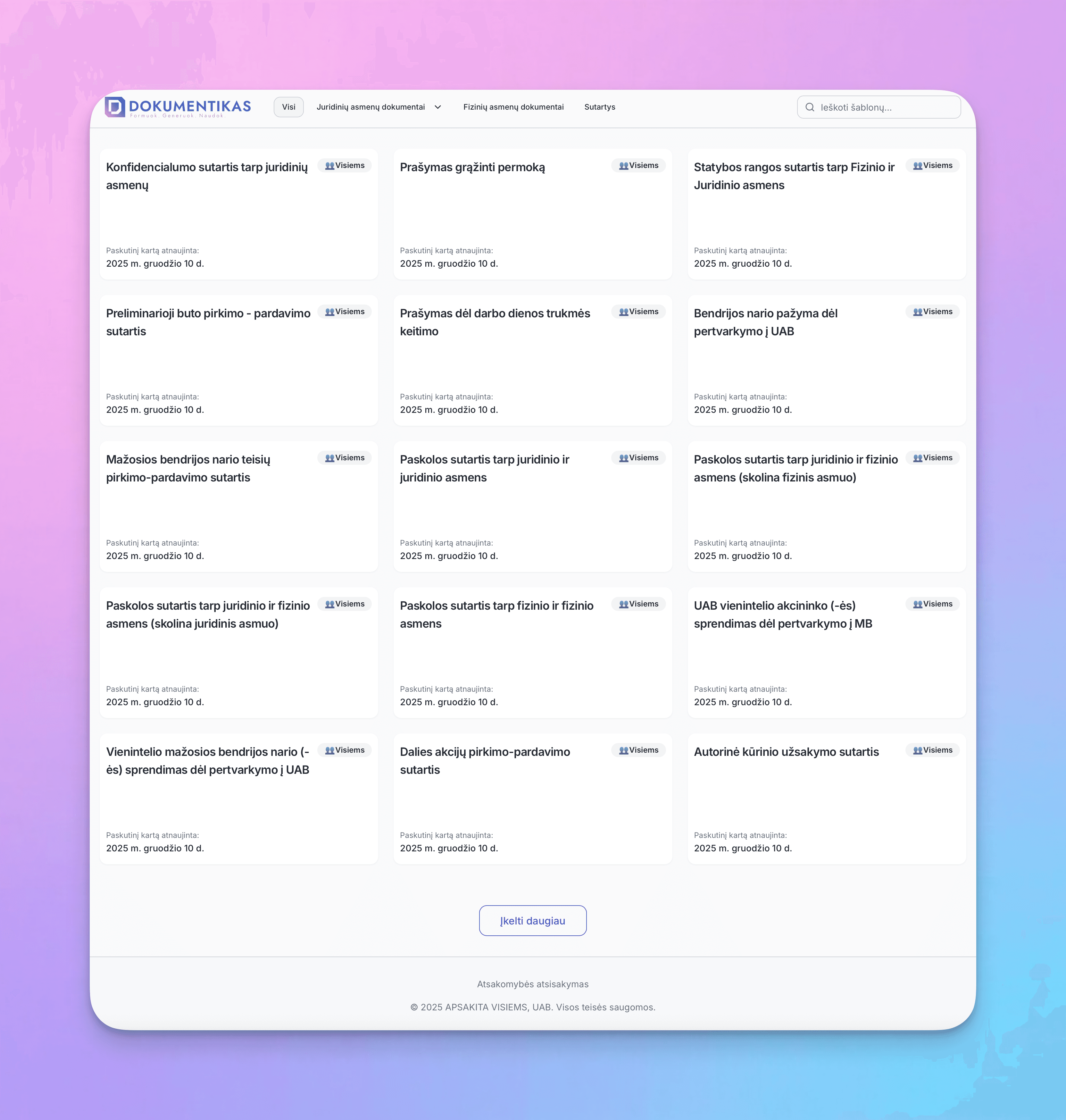 Naudokite aiškius, nuolat atnaujinamus dokumentų šablonus, pritaikytus Lietuvos teisinei aplinkai.