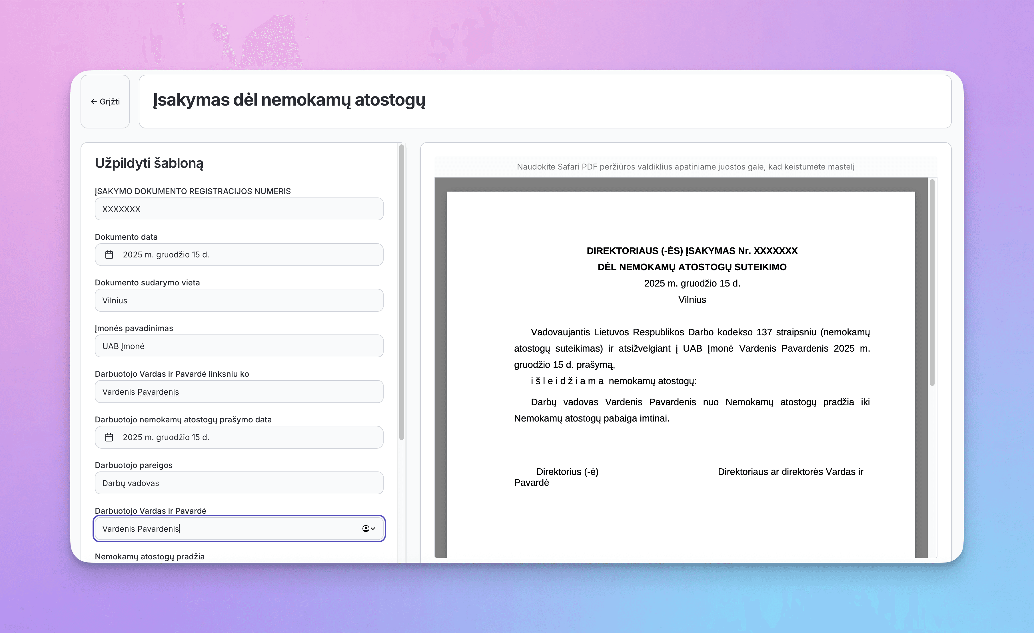 Greitai susikurkite įgaliojimus, prašymus, sutartis ir kitus kasdienius dokumentus. Tiesiog įveskite duomenis ir atsisiųskite parengtą failą.